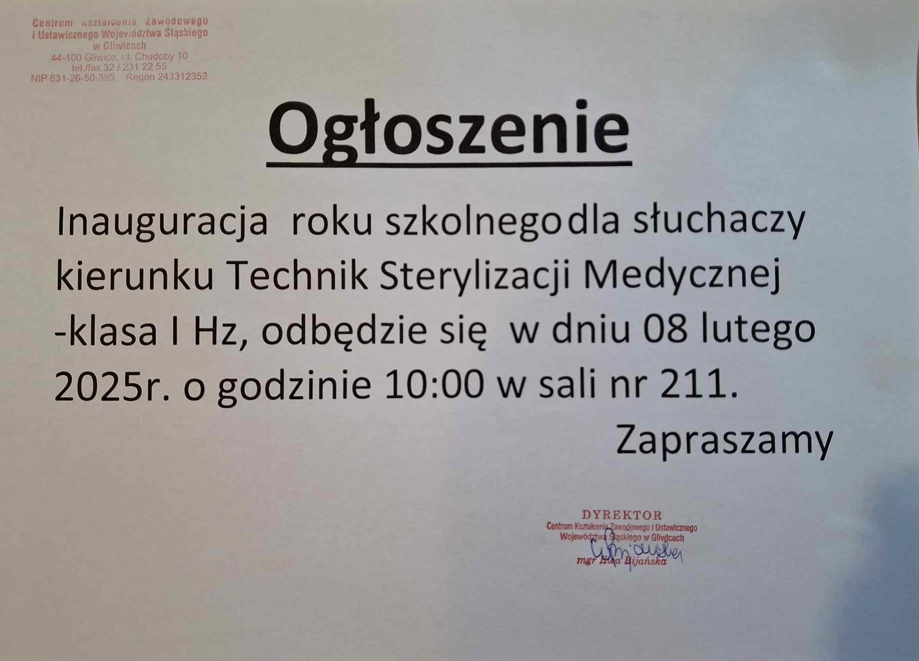 W dniu 08.02.2025r. odbyła się Uroczysta Inauguracja Roku Szkolnego dla nowo przyjętych słuchaczy kierunku Technik Sterylizacji Medycznej.